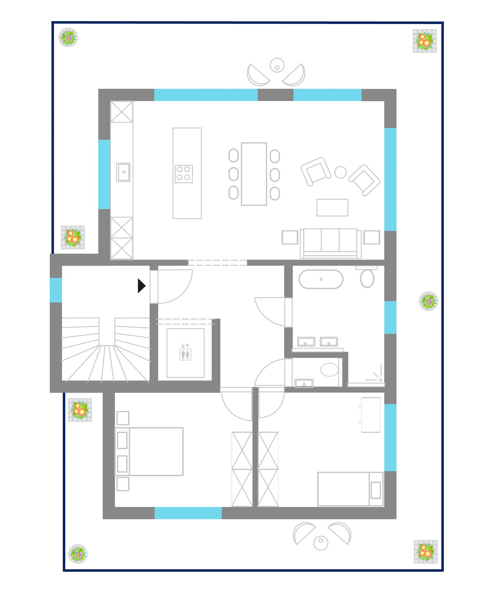 - Zeitloses Design mit bodentiefen Fenstern, im Wohn- und Essbereich ergänzt durch großzügige Schiebeelemente.